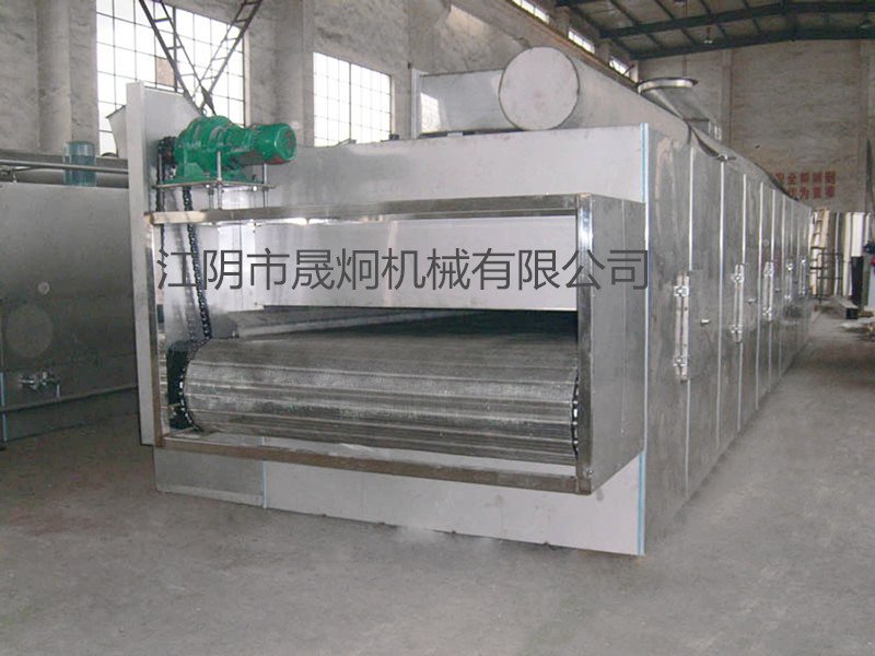 料斗中的物料由加料器均匀的铺在不锈钢丝网上,由传动电机带动网带在干燥箱内匀速移动。干燥段由若干单元组成,热风在两个(或多个)单元内横向循环,新鲜空气由风机进入,通过换热器加热,热空气穿过物料层与物料热交换,进入下腔,然后流向下一单元,降温后的热空气再经换热器进行二次加热,热空气穿透网带与物料再次热交换,湿热空气由排湿风机排出,完成干燥,每台干燥机单元数可根据物料的特性、工艺要求选取。